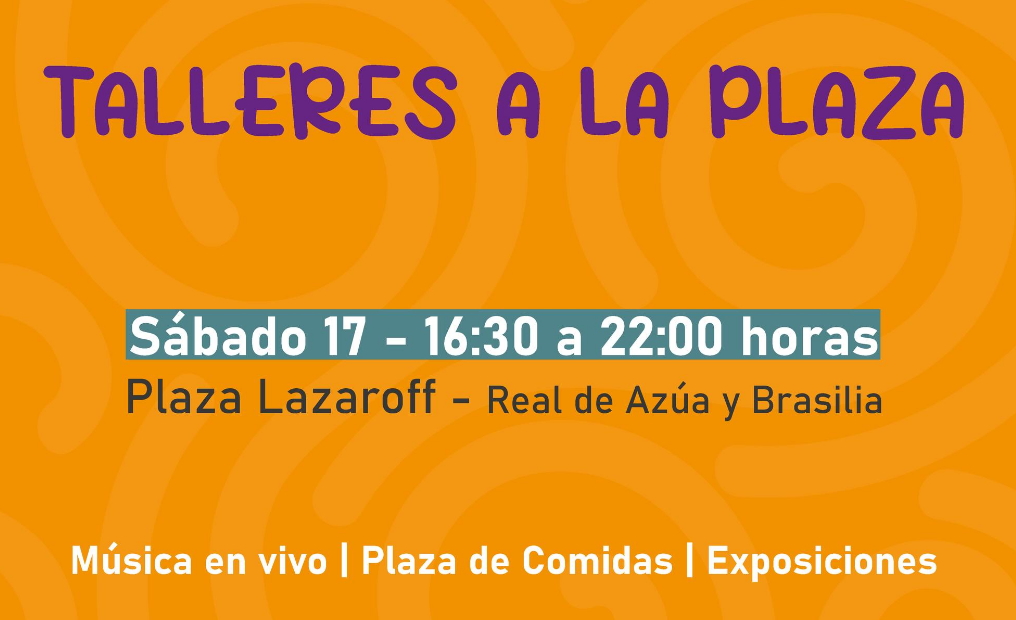A partir de las 16:30 horas y hasta las 22:00, se celebrará la actividad denominada «Talleres a la Plaza» en Ciudad de la Costa. Será precisamente en la Plaza Lazaroff ubicada en Real de Azúa y Brasilia. Habrá música en vivo, plaza de comidas y exposiciones.