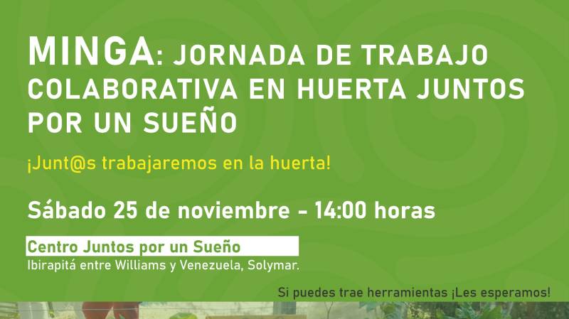El próximo sábado 25 de noviembre, a las 14:00 horas, se llevará a cabo un evento de colaboración para trabajar en la huerta del centro Juntos por un Sueño, ubicado en Ibirapitá entre Williams y Venezuela.