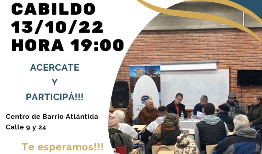 El jueves 13 de octubre se estará desarrollando el Cabilo del Municipio de Atlántida a partir de las 19:00 horas en el Centro de Barrio Atlántida, en Calle 9 y 24 (ex Deportivo). En dicha instancia se pueden recibir propuestas de Organizaciones Sociales o vecinos agrupados, estudiantes y particulares. El correo para el envío de propuestas es: coordinacion.municipioatlantida@gmail.com